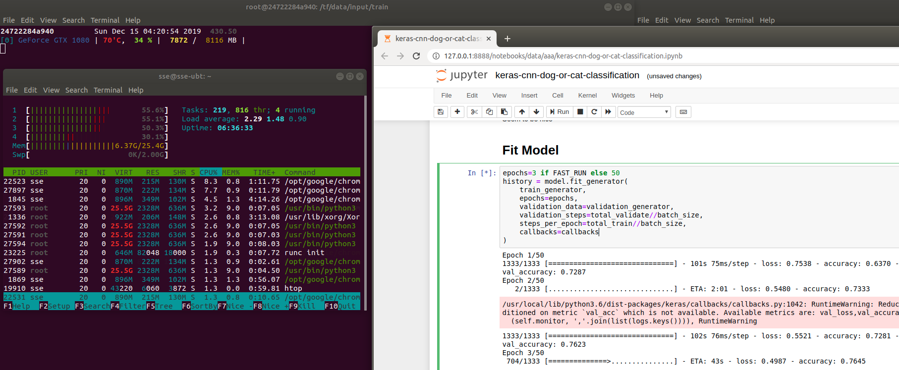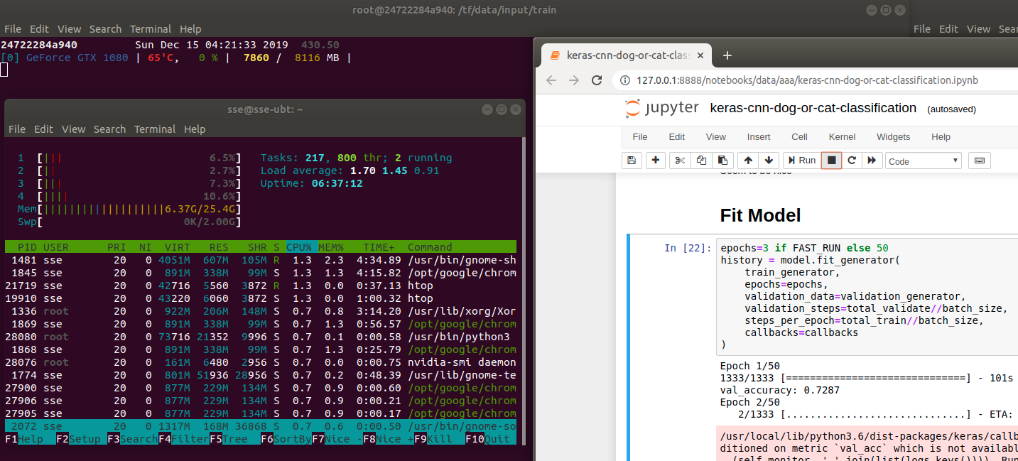컨테이너 내에서 kaggle의 예제를 돌리고, gpustat을 확인했을때 GPU가 사용됨을 확인