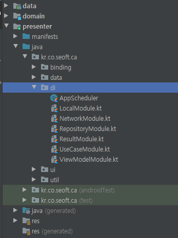 | - 뷰,뷰모델을 위한 유틸성 클래스들 - 프레젠터계층용 data - di 구성요소 - 뷰, 뷰모델 |