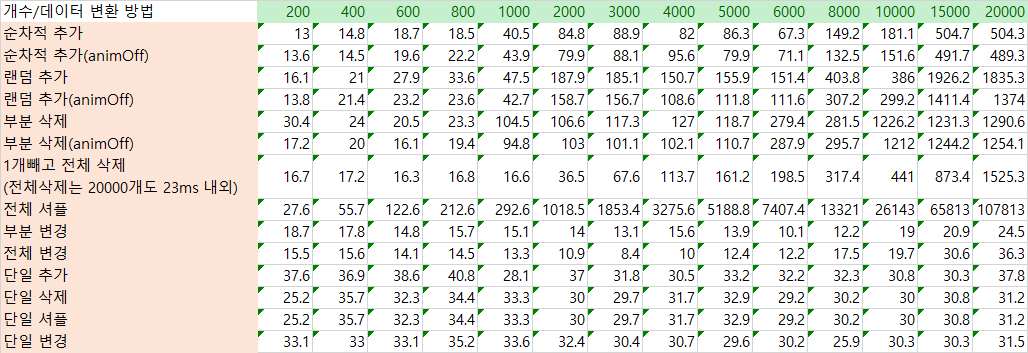 - 개인차가 있어 몇 ms부터 느리다고 판단하기는 힘들지만 랜덤 추가방식 경우 2000개, 삭제 경우 6000개 이상이 될 경우 160ms, 200ms 가 넘으면서 사용자 입장에서 반응이 느리게 느껴질 수도 있을듯합니다.